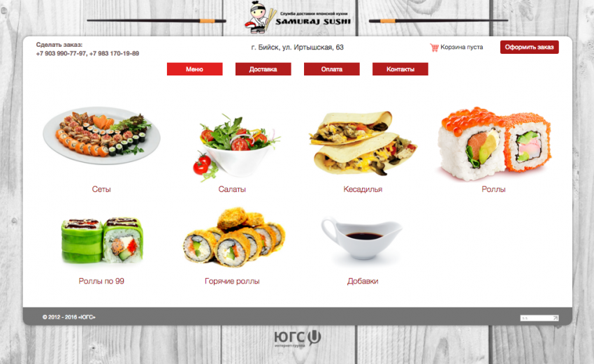 2. Почти одновременно мы запустили сервис по доставке еды в городе Бийске, Алтайского края. Нашим партнером в городе Бийске стала - Служба доставки японской кухни "Самурай Суши". Сервис быстро начал приносить прибыль, партнер доволен, а пользователи сервиса отмечают его удобство и простоту в использовании.